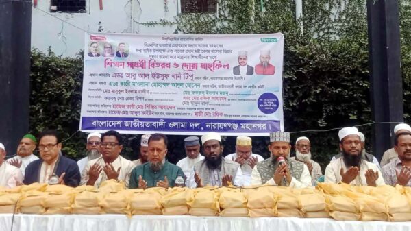 শনিবার (২৯ নভেম্বর) সকালে শহরের মিশনপাড়া হোসিয়ারি কমিউনিটি সেন্টারে বাংলাদেশ জাতীয়তাবাদী ওলামা দল নারায়ণগঞ্জ মহানগরের আয়োজনে অনুষ্ঠিত হয় এ শিক্ষা সামগ্রী বিতরন ও দোয়া মাহফিল অনুষ্ঠান।